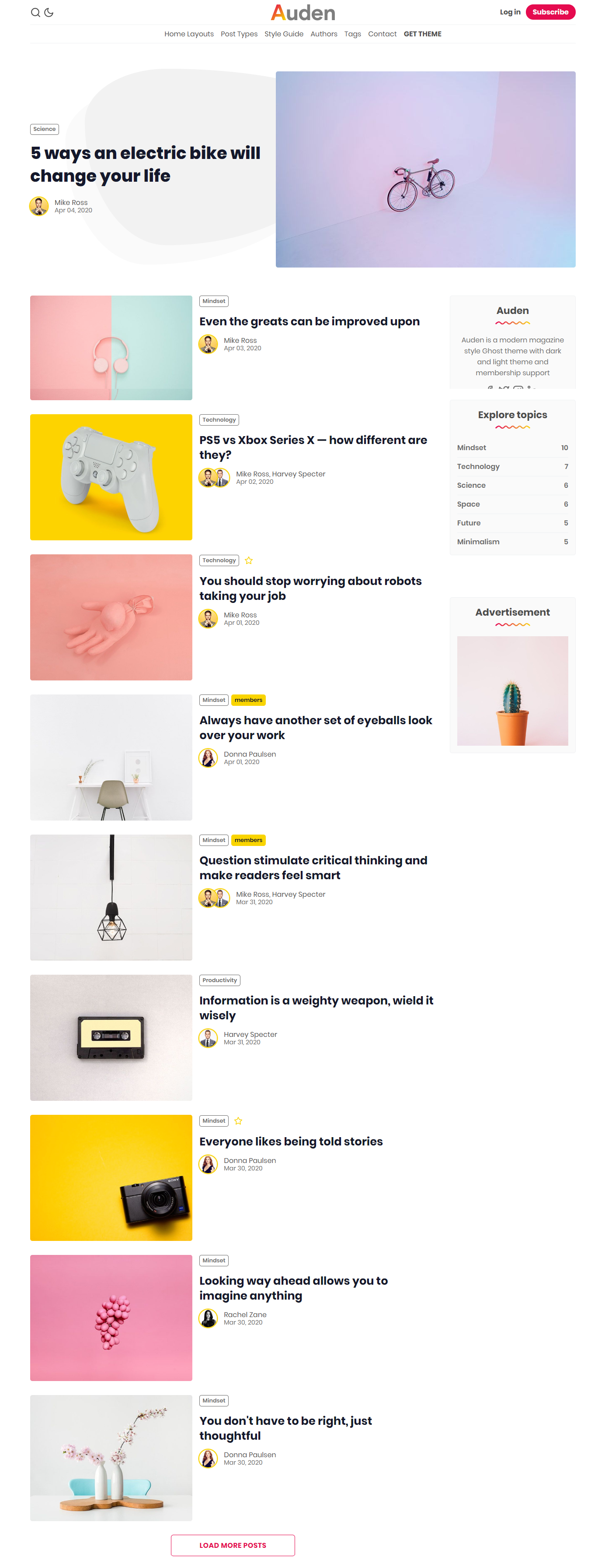 Auden comes with 3 different home layouts: default: 3 column (2 posts + sidebar) home2: 2 column (1 post + sidebar) home3: 3 column (3 posts) In the documentation you can find instructions how to activate them.